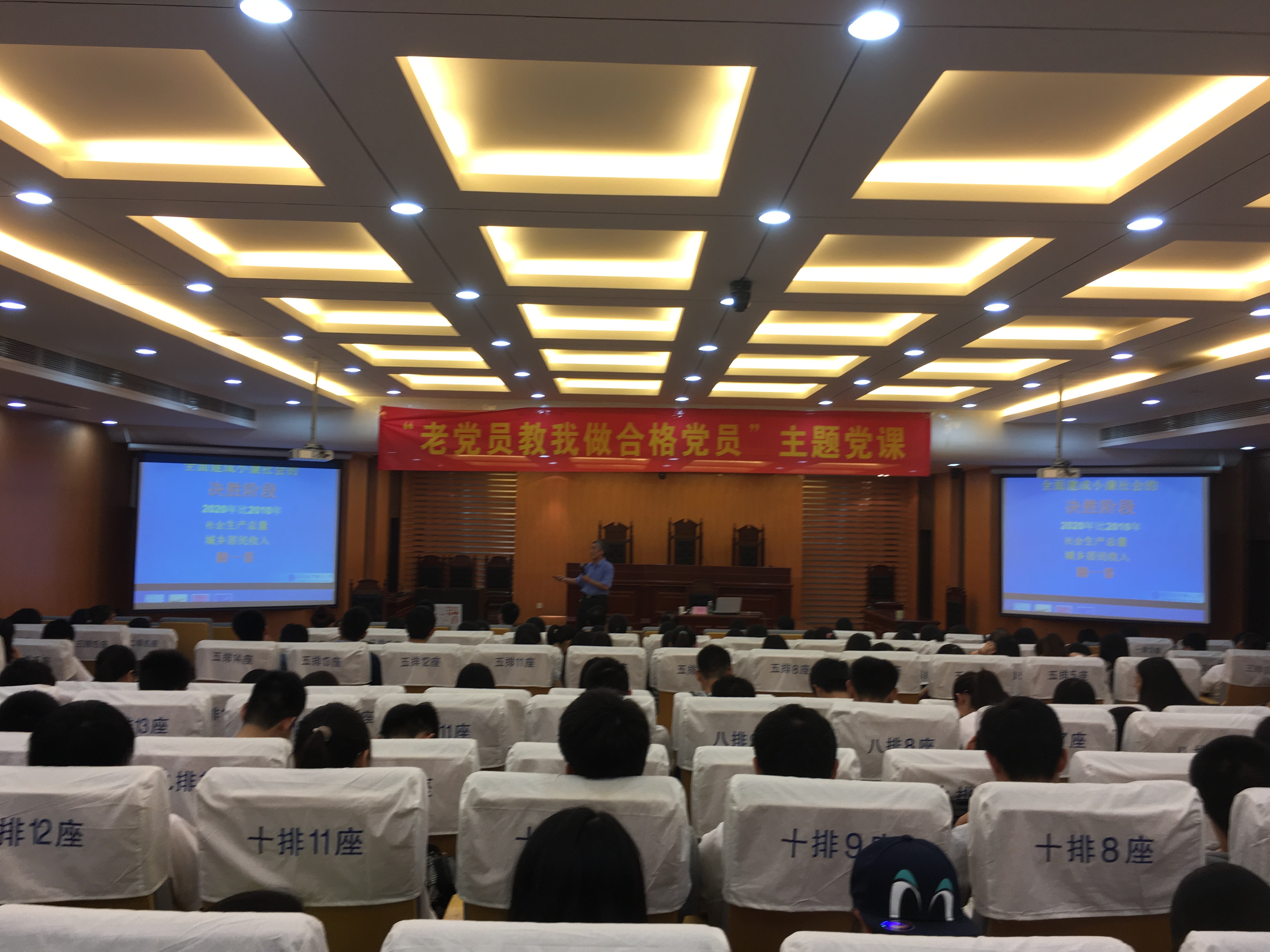 5月31日下午,人文与社会科学学院“两学一做”学习教育之“老党员教我做合格党员”主题党课在学院模拟法庭举办,校关工委常务副主任丁荣茂为人文学院、澳门网投十大信誉平台的党员同志、全体研究生党支部书记及人文学院15级本科生开讲。人文学院党委书记张启钱主持了本次党课。