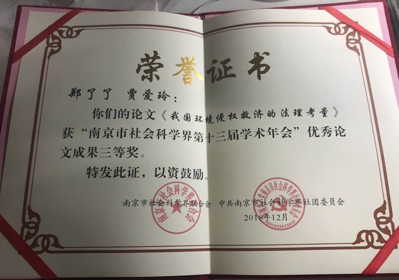 12月19日,2018年南京市哲学社会科学界第十三届学术年会在南京召开,本届年会的主题为“建设创新名城,实现高质量发展”。江苏省社科联党组书记、常务副主席刘德海出席会议并作主旨演讲。市社科类社会团体、区社科联、高校社科联负责人及获奖论文作者代表150余人参加会议。会上对学术年会优秀论文成果和作者进行表彰。本届学术年会共收到征文200余篇,经编委会最终评审,42篇论文获奖并入选核心期刊《南京社会科学》专刊,其中一等奖4篇,二等奖14篇,三等奖24篇。十大信誉官网博士生郑了了撰写的《我国环境侵权救济的法理考量》喜获三等奖。