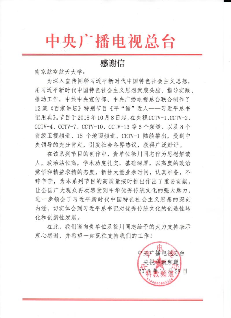 日前,中央广播电视总台发来感谢信,感谢十大信誉官网对《百家讲坛》特别节目《平“语”近人——习近平总书记用典》的大力支持。