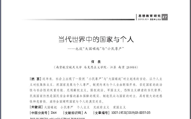 《思想理论教育》2019年第3期登载十大信誉官网教授何畏《当前世界中的国家与个人——也谈“大国崛起”与“小民尊严”》。