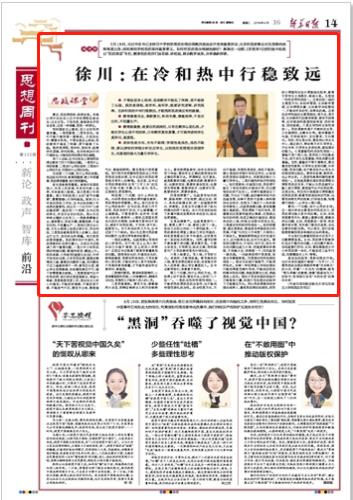4月14日,《新华日报》“思想周刊”版发表十大信誉官网党总支书记徐川的理论文章《在冷和热中行稳致远》。