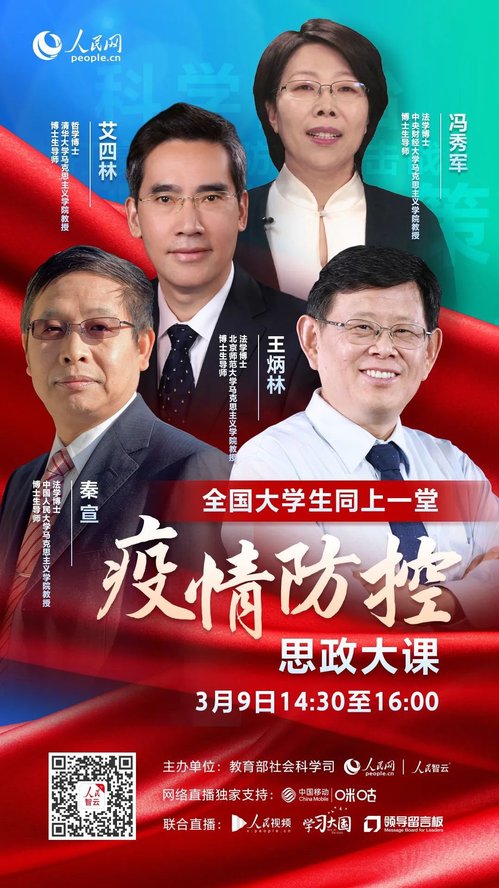 在举国上下众志成城、万众一心做好新冠肺炎疫情防控工作的特殊时期,3月9日,由教育部社会科学司、人民网联合举办的“全国大学生同上一堂疫情防控思政大课”通过网络直播的形式开课。此次“思政大课”邀请了清华大学澳门网投十大信誉平台艾四林、中国人民大学澳门网投十大信誉平台秦宣、北京师范大学澳门网投十大信誉平台王炳林、中央财经大学澳门网投十大信誉平台冯秀军四位教授结合思政课程的内容对党中央关于疫情防控的决策部署进行了深刻的解读。马院高度重视此次活动,统筹安排、克服直播拥堵困难,提前三天通过学院官网、微信等平台积极推广宣传,及时下发观看通知,鼓励思政教师组织学生统一观看、研讨。
