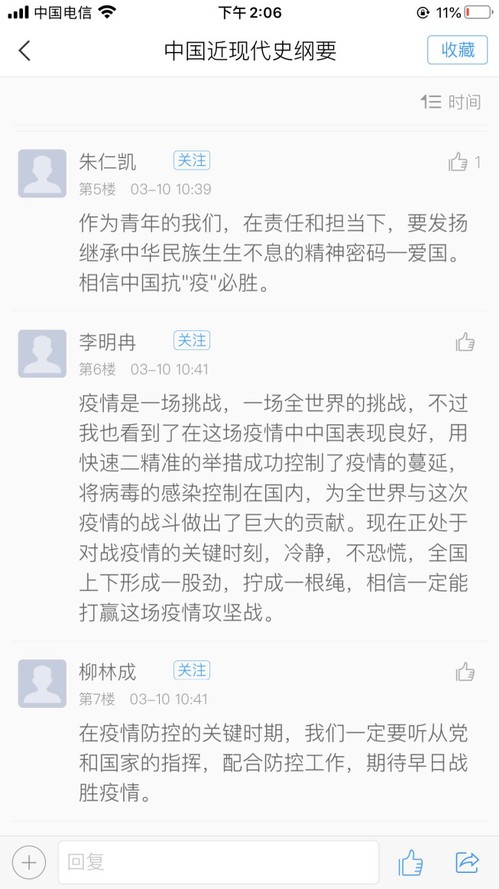 孙佳敏老师的中国近现代史纲要课发起了“如何看待疫情下的中国担当”大讨论,引起了学生的广泛参与。“疫情发生后,武汉采取封城的措施来阻断病毒传播,不惜损失巨大的经济利益来控制疫情,在这种特殊时期,党和国家都把人民的生命安全、身体健康放在第一位,为了实现人的自由全面发展而努力。中国,我真的服!中国,我真的爱!”长空学院易禹阳同学如是感叹。