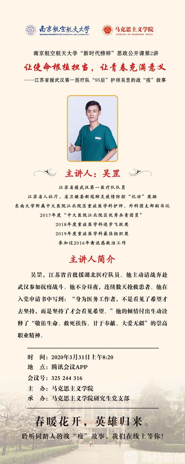 3月31日上午,由澳门网投十大信誉平台主办的“新时代榜样”思政公开课在线上正式开讲。本次公开课邀请了江苏省支援武汉第一医疗梯队“95”后护师吴罡,通过腾讯会议向师生讲述了抗疫过程中的感人故事。