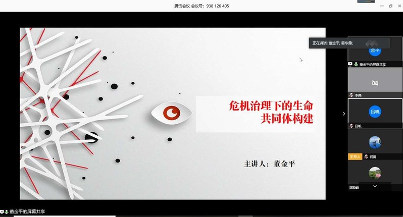 董金平老师以“文字为沙,声音为龙”,以腾讯会议为平台,以新冠疫情为切入口,首先区分日常治理和危机治理的区别;提出危机治理的前提是生命共同体意识的建构,并从认知、情感和行动三个方面解释危机治理的思想前提;最后提出,生命共同体意识的形成会产生一种合力,即行动力、平衡里和凝聚力,从而帮助整个生命共同体在危难时刻渡过难关。