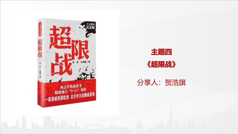 贺浩旗同志分享了乔良的《超限战》,号召同志们理解超限战军事理论,筑牢思想防线,夯实理论基础,为新时代社会主义意识形态建设工作尽一份力量。