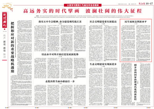 当此之时,十九届五中全会将共同富裕纳入十五年远景目标,并据此制定相应的五年规划--民生福祉达到新水平,实现更加充分更高质量就业,居民收入增长和经济增长基本同步,分配结构明显改善,基本公共服务均等化水平明显提高,全民受教育程度不断提升,多层次社会保障体系更加健全,卫生健康体系更加完善等。推进民生福祉的事业,发展升级到新台阶、目标愿景升级到新层次、规划举措升级到新水平。