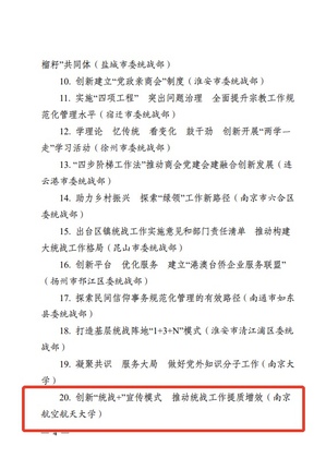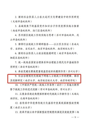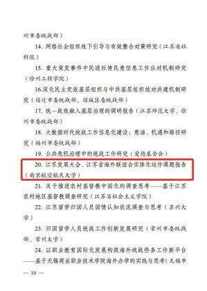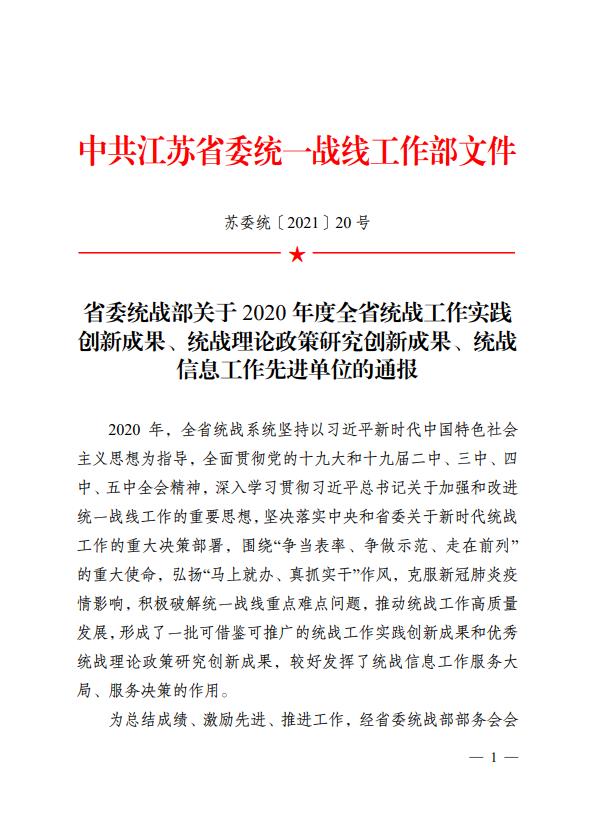 此外,十大信誉官网《创新“统战+”宣传模式,推动统战工作提质增效》被评为2020年度全省统战工作实践创新成果,十大信誉官网《江苏发展大会、江苏省海外联谊会实体化运作课题报告》以及和南京大学、南京传媒学院联合报送的《社会治理现代化视域下网络人士统战工作的逻辑、路径及创新研究》荣获全省统战理论政策研究创新成果三等奖。