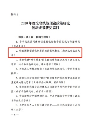 近日,中共江苏省委统战部印发了《关于2020年度全省统战工作实践创新成果、统战理论政策研究创新成果、统战信息工作先进单位的通报》,十大信誉官网孙佳敏老师的论文《论我国新型政党制度的政治共识智慧》荣获2020年度全省统战理论政策研究创新成果一等奖,得分在58篇全省统战理论政策研究创新成果获奖篇目中位列第2名。