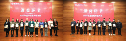 会上颁发了2020年度十佳宣传信息员、好新闻奖、金评论奖、2019-2020年校园文化品牌项目、优秀二级网站等奖项,杭育新、李遥、王晖分别为获奖个人和集体颁奖。
