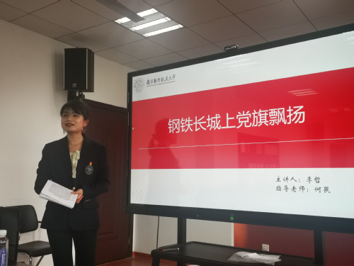 李哲以《钢铁长城上党旗飘扬》为题,在党史学习的基础上,基于“人民军队从哪里来”“人民军队做了什么”和“人民军队何处去”三个问题进行了一系列阐述结合南航人航空报国情怀强调了党史学习的重要性。宋青励以从“钢”与“气”谈起——百年大党与中国巨变为题毛泽东同志提出的“钢”与“气”出发讲到习近平总书记抗击新冠肺炎疫情再次强调“钢”与“气”提供党史学习的新视角陈琳以“证”名中国共产党命名的曲折历程为题讲述了中国共产党命名经历曲折过程,曲折背后,中国共产党早期开创者们对于建党一系列问题的思考探索,从“证”名角度丰富了党史学习内容