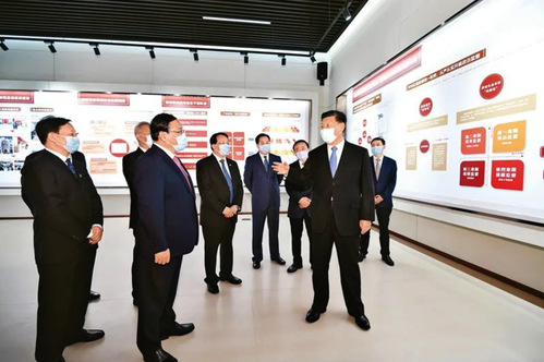 2020年11月12日,浦东开发开放30周年庆祝大会在上海市举行。中共中央总书记、国家主席、中央军委主席习近平在会上发表重要讲话。这是当天上午,习近平等参观“在国家战略的引领下——浦东开发开放30周年主题展”。新华社记者 殷博古/摄