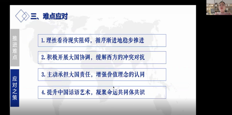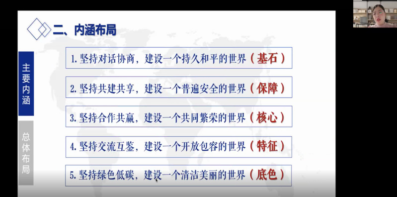 接着,邢老师简单介绍了“人类命运共同体”思想的主要内涵与总体布局。“人类命运共同体”思想旨在建设“持久和平、普遍安全、共同繁荣、开放包容、清洁美丽”的世界。为了达成这一目标,我们要继续推动高质量共建“一带一路”和发展亚洲基础设施投资银行,构建周边命运共同体,打造发展中国家命运共同体,构建新型国际关系,建立新型的全球治理格局。