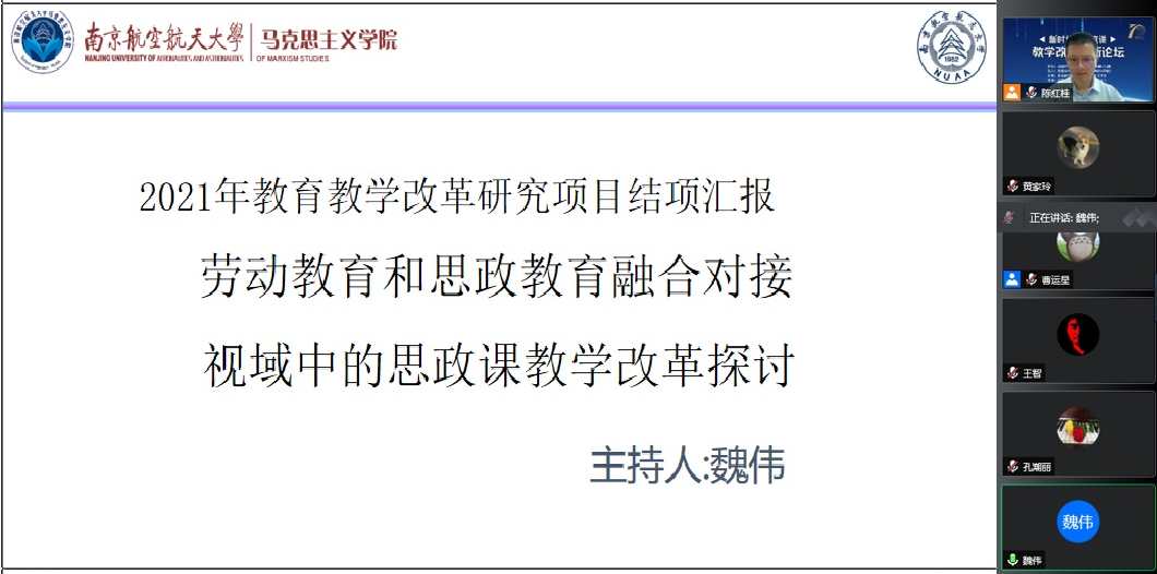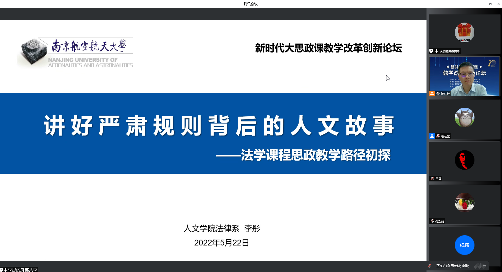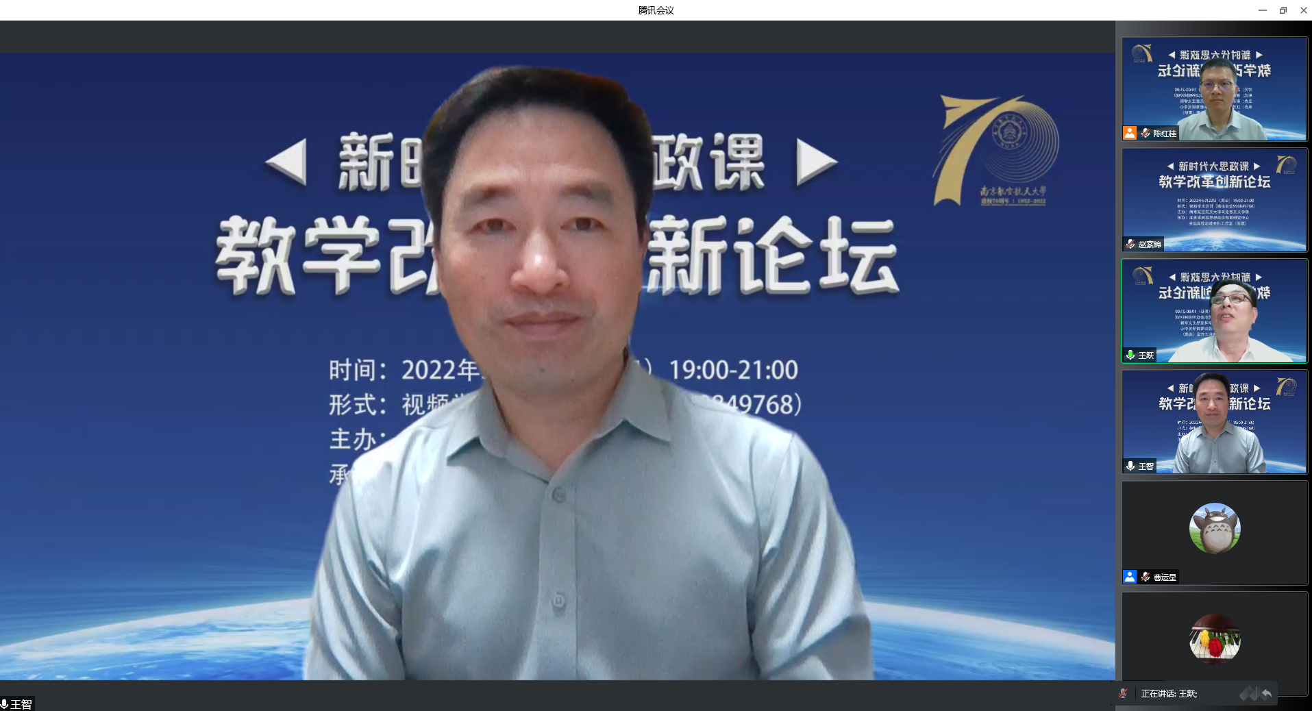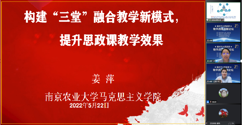 2022年5月22日,由澳门网投十大信誉平台、江苏省高校思想政治教育研究中心、全国高校思政名师工作室(南航)主办的新时代大思政课教学改革创新论坛在十大信誉官网召开。来自南京大学、南京师范大学、苏州大学、河海大学、南京农业大学、江南大学、南京艺术学院等多所高校的专家学者,以线上方式参加了本次论坛。