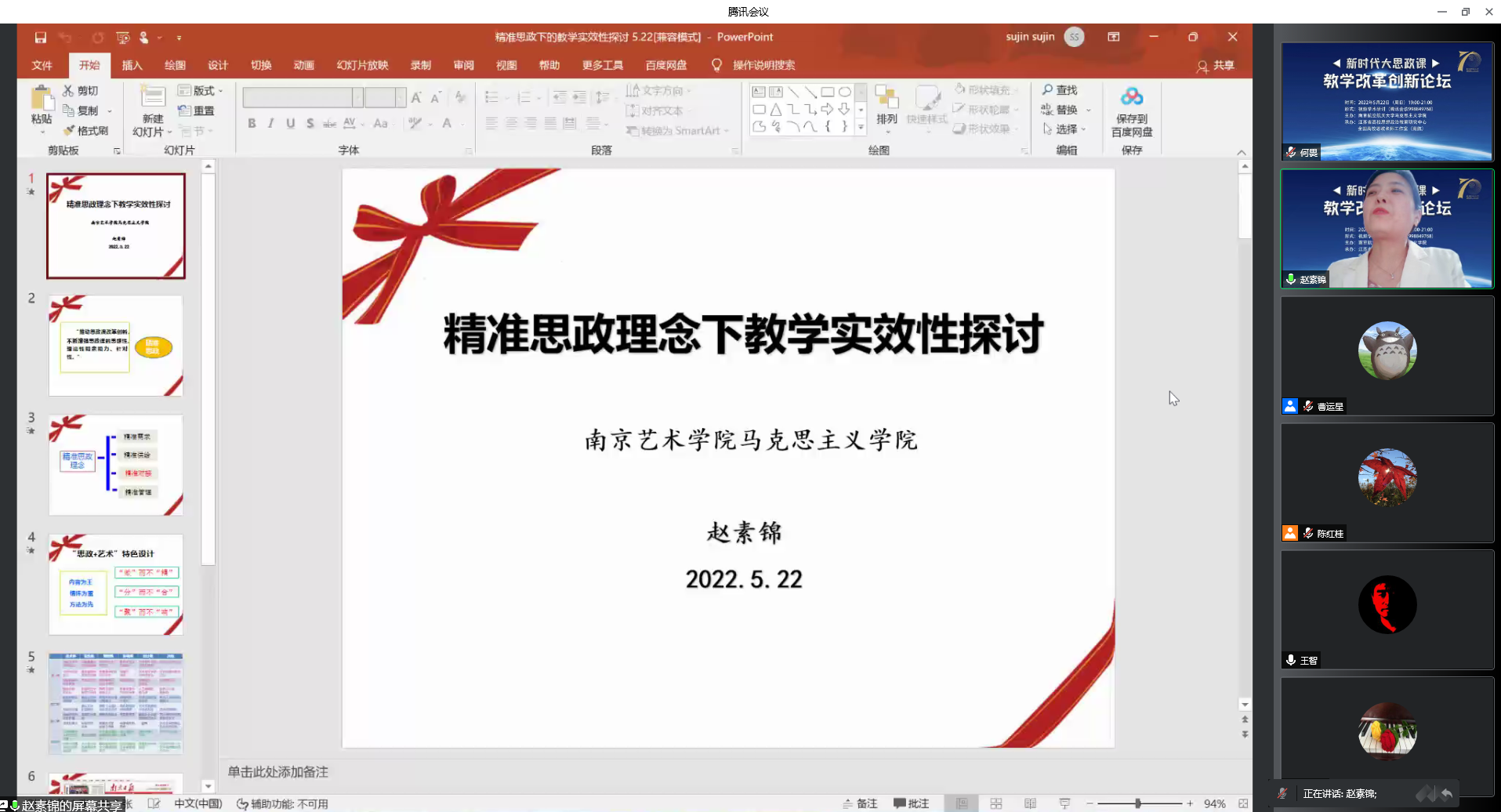 南京艺术学院澳门网投十大信誉平台赵素锦副院长就精准思政理念下提升教学实效性做了分享。她从研究精准需求、注重鲜明特色、情怀为重、方法为先、精准施策等角度阐释了对大思政课改革创新的理解。还介绍了南京艺术学院在精准思政方面的探索和经验做法。