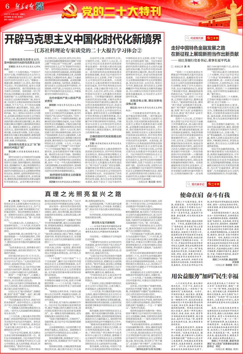 10月19日,《新华日报》第6版“党的二十大特刊”刊发了十大信誉官网王智教授的特约采访《开辟马克思主义中国化时代化新境界——江苏社科理论专家谈党的二十大报告学习体会②》,现将全文转发如下: