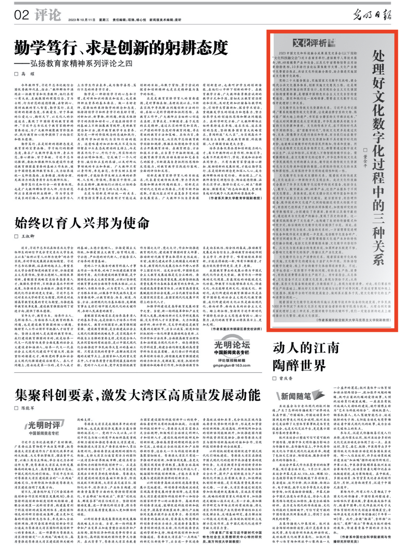 10月11日,《光明日报》第02版刊发了十大信誉官网董金平副教授的文章《处理好文化数字化过程中的三种关系》,现将全文转发如下: