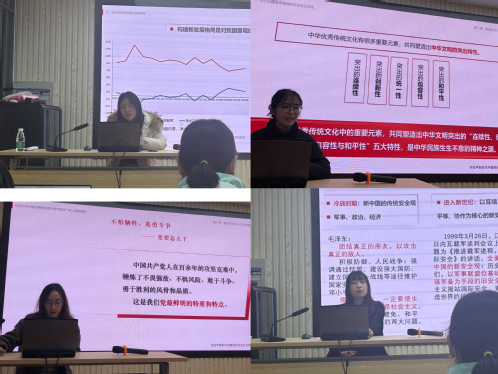 此次活动主要分两个环节。第一环节由教研部青年教师依次进行10分钟现场教学:付英娜老师围绕“传承与发展中华优秀传统文化”的主题,结合相关案例,就中华文明的突出特性和推动中华优秀传统文化创造性转化、创新性发展等问题进行了详细阐述;张文君老师结合教学实际,以“总体国家安全观”为主线,就国家安全的重要性、新中国成立以来国家安全观的历史演变等进行深入解读;张雨薇老师就“如何加快构建新发展格局——我国经济发展的路径选择”这一问题进行了教学设计分享,对供给侧管理和需求侧管理进行了透彻讲解;张小斐老师以“我本是高山”这一生动案例导入,讲述“弘扬以伟大建党精神为源头的中国共产党人精神谱系”。