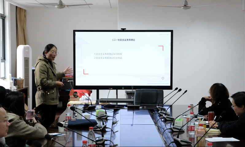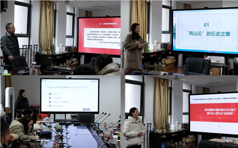 活动第一个环节由四位青年教师依次进行8分钟教学展示:施灿业老师以“人类命运共同体的内涵”为主题,从马克思的共同体理论以及共同体在中西方的概念演化中阐释人类命运共同体的深层逻辑;陈子烨老师以“如何理解‘绿水青山就是金山银山’”为主题,从历史、理论、实践三重维度深入剖析了“两山论”;邢瑞利老师以“如何理解改革是中国的第二次革命”为主题,围绕“改革究竟改的是什么”“为什么一定要进行改革”“如何理解改革的重大意义”三个方面展开阐述;黄璐老师以“如何理解中国式现代化打破了‘现代化=西方化’的迷思”为主题,重点说明中国式现代化五个方面的中国特色及其对西方现代化理论和实践的重大超越。