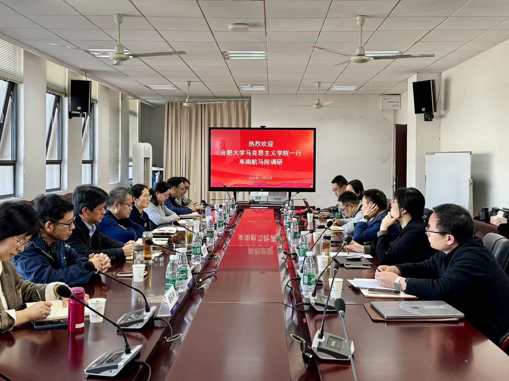 2025年11月26日,合肥大学澳门网投十大信誉平台党委书记鲁先瑾、院长苏冰和思政课教师一行来十大信誉官网调研座谈,十大信誉官网党委书记何畏、院长王智和部分领导班子成员及教师代表参加了座谈交流。