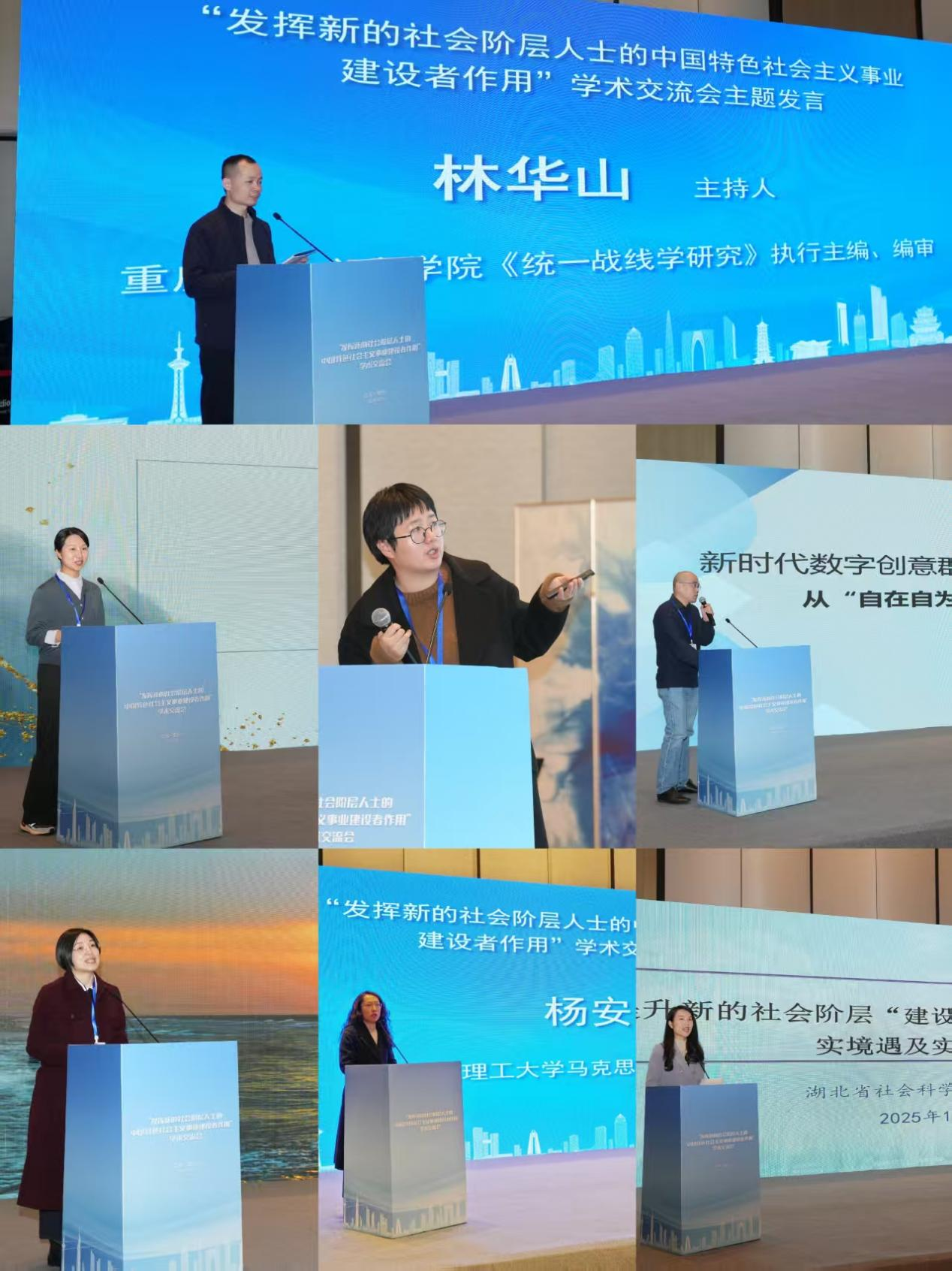 主题发言的第一个阶段由重庆社会主义学院《统一战线学研究》执行主编、编审林华山主持。江苏省社会科学院社会学研究所副研究员后梦婷,南京师范大学新闻与传播学院副教授、网络人士与新的社会阶层人士研究中心执行主任张伟伟,江苏省社会主义学院科研处四级调研员吉强,湖南省社会主义学院教授雷明贵,武汉理工大学澳门网投十大信誉平台副教授杨安妮,湖北省社会科学院马克思主义研究所助理研究员李盛婷分别作主题为《新的社会阶层人士的概念生成、发展规律和未来趋势》《新时代新的社会阶层人士统战话语体系构建研究》《新时代数字创意群体建设力发挥研究》《链接“建设者”发挥“建设力”——基于湖南湘江新区“把新联会建在产业链上”案例的分析》《新的社会阶层人士协商式参与的路径优化与机制构建》《提升新的社会阶层“建设力”:理论渊源、现实境遇及实践路径》的报告。