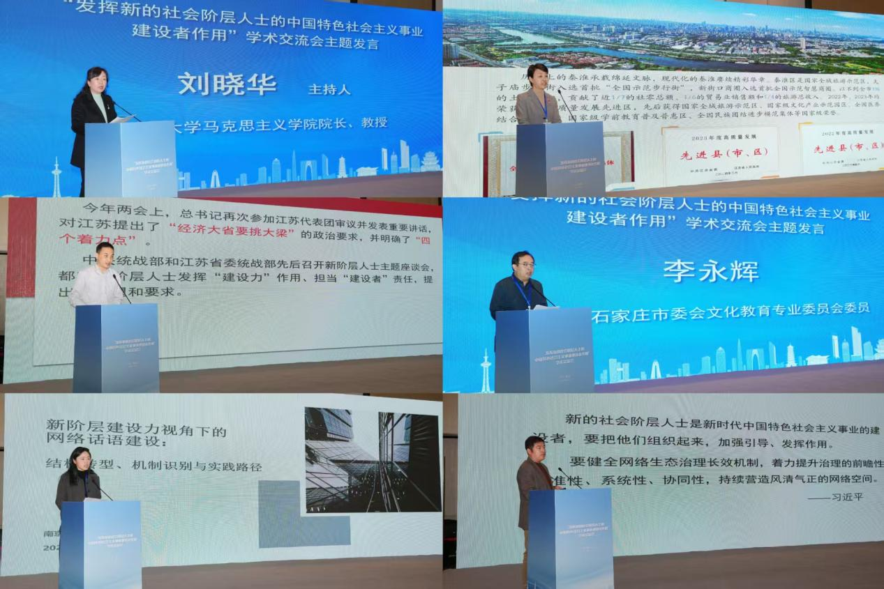 主题发言的第二个阶段由常州大学澳门网投十大信誉平台院长、教授刘晓华主持。南京市秦淮区委统战部常务副部长奚巍蔚,无锡市委统战部办公室副主任魏龙,九三学社石家庄市委会文化教育专业委员会委员李永辉,南京理工大学设计艺术与传媒学院讲师唐希璐,常州大学瞿秋白政府管理学院教授丛玉飞分别作主题为《团结引导新的社会阶层人士发挥建设力作用的实践创新研究——以秦淮区为例》《新的社会阶层人士发挥建设力作用的方法路径研究——以无锡市为例》《新时代党的统一战线理论下新阶层建设力的高质量发展研究》《数字化转型背景下新阶层“建设力”生成机制与统战实践路径研究》《新社会阶层参与网络社会治理的创新实践——以C市辟谣联盟为例》的报告。